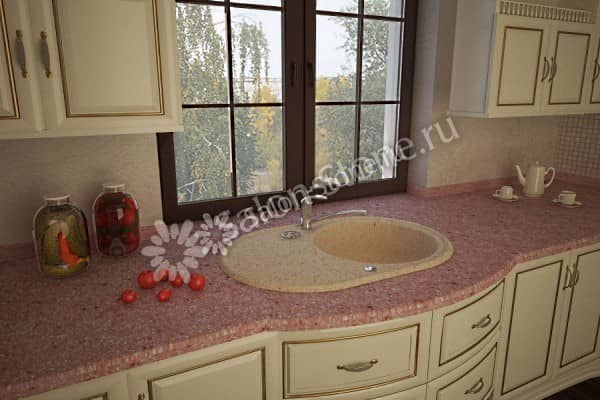 Столешница из искусственного камня, выполненная в едином стиле с раковиной, имеет солидный вид, удобна в эксплуатации и отличается экологической безопасностью при ее недорогой стоимости. Искусственный камень, как отделочный материал для кухни, хорош еще и тем, что приспособлен ко всем нюансам в процессе приготовления пищи - воздействию острых и режущих предметов, горячих температур, красящих веществ, агрессивных компонентов, и прочего. Трещины, вмятины, въевшиеся пятна - вот что ожидает поверхность любого новенького гарнитура спустя некоторое время эксплуатации, чего нельзя сказать об искусственном камне. К тому же, по сравнению с деревом, его поверхность абсолютно гигиенична и не способствует размножению болезнетворных микроорганизмов, что немаловажно на кухне, а также и в ванной комнате.