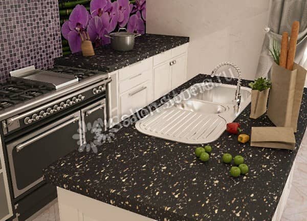 При выборе изделий из камня стоит обратить внимание на следующие показатели: гранит или мрамор намного тяжелее искусственного камня при их слабой сопротивляемости, а также заметно холоднее на ощупь. Природный материал отличается пористой структурой, из-за чего в нем накапливаются загрязнения; он подвержен влиянию кислот, вследствие чего возможно его разрушение. Столешница из искусственного камня выдерживает температуру 150-160 градусов, а при заказе кухонной столешницы клиенту предлагается акционная врезка прутиков из нержавейки в качестве подставки под горячее.