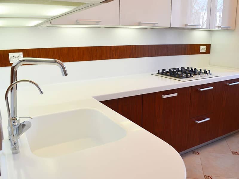 Белая столешница из искусственного камня с литой мойкой